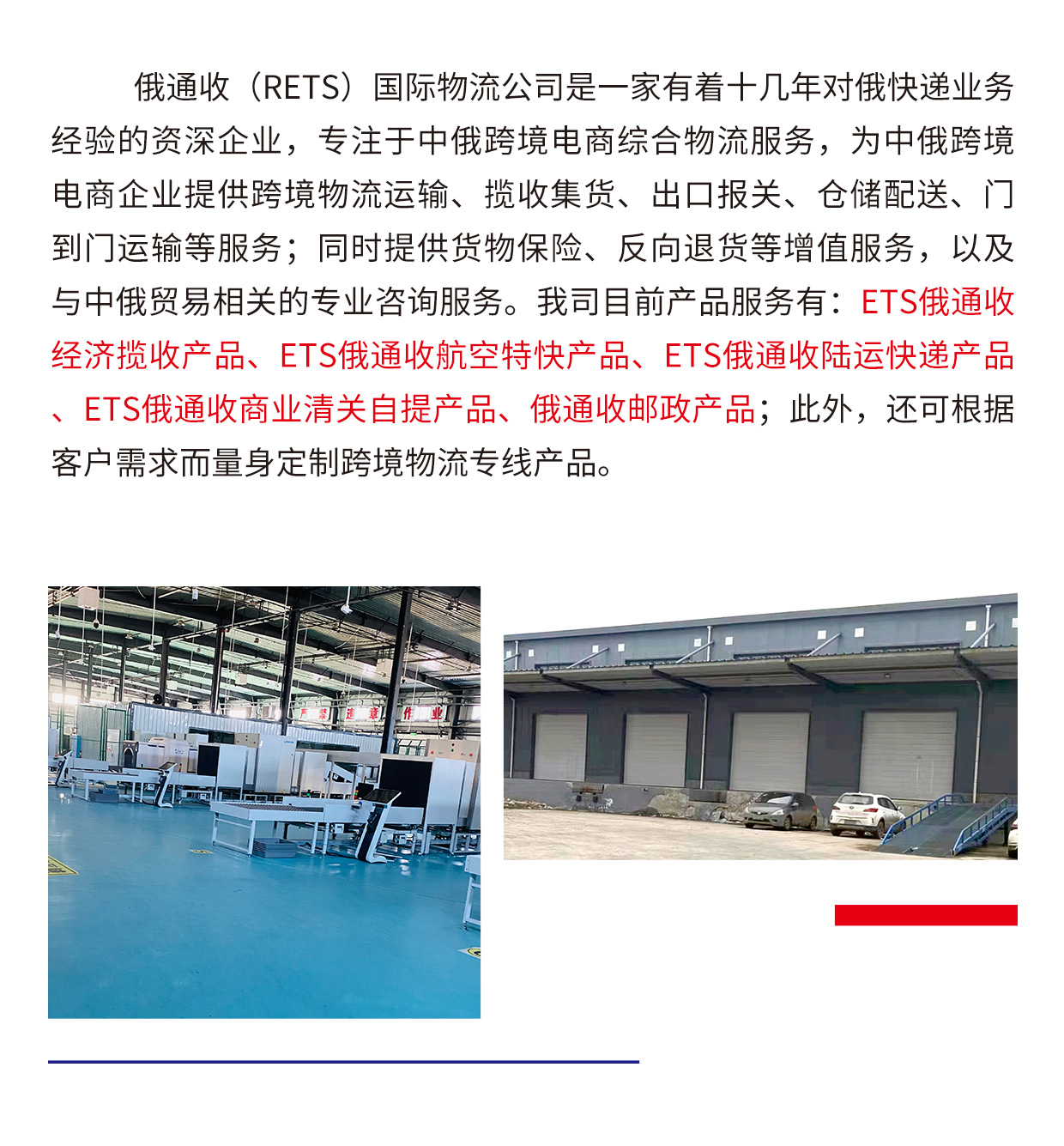 俄通收國際物流有限公司(簡稱ETS)ETS與OZON平台、UNITRADE公司強強聯合,在OZON平台爲廣大的從事俄羅斯跨境電商的賣家打造了一個全新的産品———俄通收經濟攬收産品(ETS ECONOMY PICKUP)。該産品是平台認可的新産品,目的就是滿足客戶最迫切的需求。如何在對俄跨境市場中尋找新的突破口,俄通收是您可信賴的選擇。